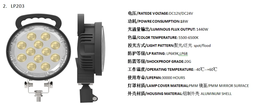 LP203是一款聚光超高效率的LED工作灯,应用比较广泛,可配手柄、开关、万向节,还可带螺旋电缆和点烟器插头。此款LED灯寿命长,防护等级高,适用于严苛的工作环境,特别适用于混凝土泵车的料斗照明,起重机工作照明等。
