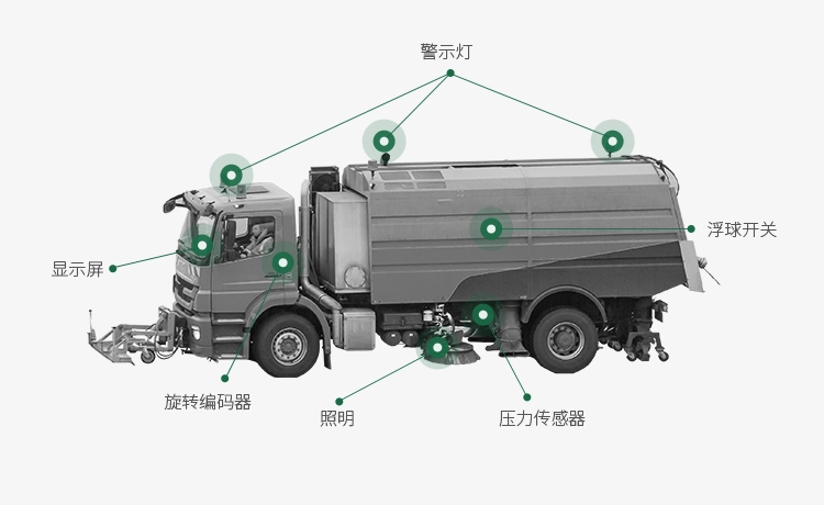 惠诚为洗扫车提供的高防护等级控制单元、线束以及接插件,使得洗扫车在尘土、污水等恶劣的工作环境下能够保持稳定运行,可根据不同吨位和功能的洗扫车进行灵活配置,高速可靠的CAN总线通讯系统能实现控制单元相互之间、控制单元与发动机ECU、IO扩展模块以及其他CANopen设备之间进行实时的数据交互,达到高效率、数字化、节能环保的控制要求。集成控制模块简化了的原本复杂的洗扫车电气控制线路,简化的控制系统降低了故障发生的频率,提高了出现问题后查找故障的便利性。