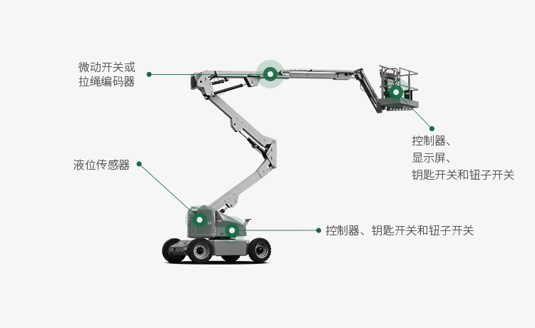 惠诚针对不同作业高度的直臂式和曲臂式高空作业车提供了接口丰富、可靠性高的控制器以及IO扩展模块,丰富的通讯接口简化整车的线路,使得布线更加简单;可选择的高分辨率4.3-12寸带按键及触摸功能的显示屏,支持CODESYS 3.5各类图形元素,可通过丰富、生动的画面设计显示各部件的工作状态以及臂展姿态和臂长等动态信息。美国霍尼韦尔钥匙开关和钮子开关用于设备的启动以及各动作的控制,具备开关寿命长,防水防污的特点。采用德国施迈赛的微动开关精准检测每节臂的臂展的位置;德国希控拉绳编码器可精确测量臂伸缩长度。